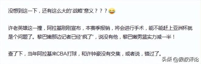今年夏天,许钟豪代表广厦征战亚冠的赛场,他和黎巴嫩球星阿拉基的对抗导致后者缺席亚洲杯更是被不少球迷调侃,许钟豪“神助攻”中国男篮减少了一个强力的竞争对手。