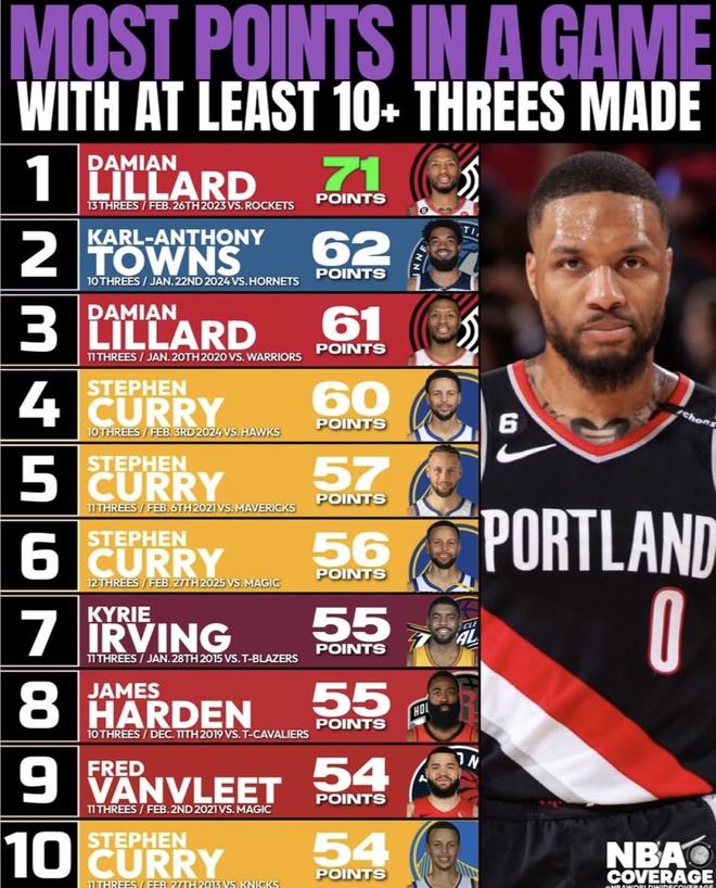 近日,NBA Coverage发布了“单场至少命中10记三分的最高得分”榜单——利拉德以71分领跑,唐斯62分紧随其后,库里四度上榜(含2025年对魔术的12记三分)。下方按对手、比分、年龄、