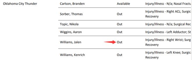 威廉姆斯在休赛期接受了右手腕完全撕裂的舟月韧带修复手术——上赛季雷霆队夺冠征程中,他一直带伤作战。10月末,他再次接受手腕后续手术,移除了康复过程中引发不适的一枚螺钉,自此便未登场过。