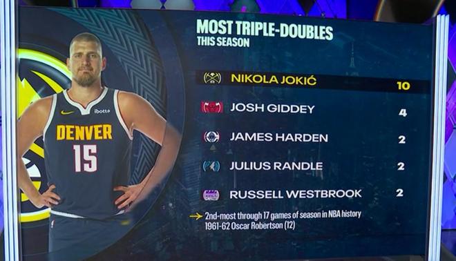 根据统计,约基奇本赛季出战17场比赛已经10次完成了三双,在NBA历史上,单赛季前17场比赛过后完成三双次数最多的球员是1961-62赛季的奥斯卡-罗伯特森,当时他在17场比赛中完成了12次三双,而约基奇的这一数据则排名NBA历史同期的第二位。