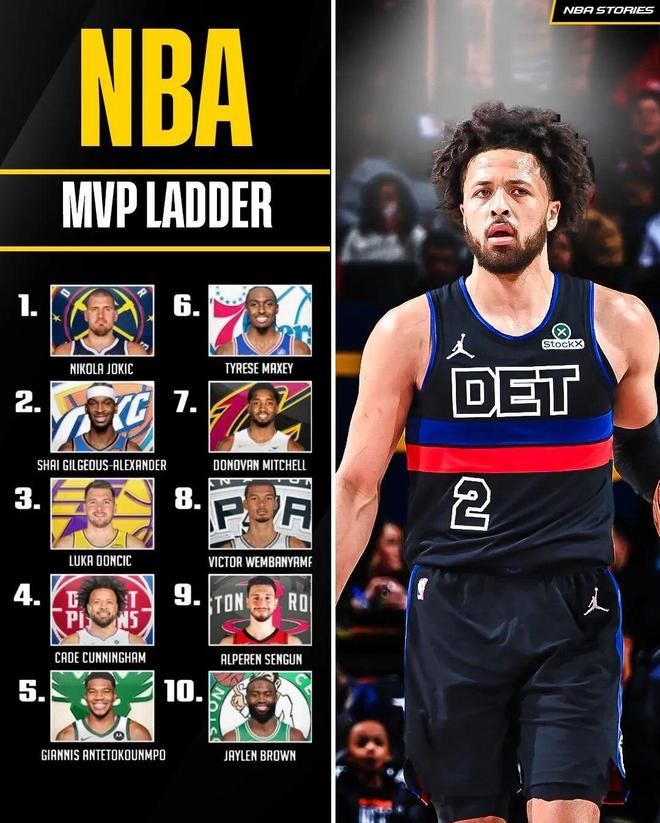 NBA官方公布的最新一期MVP排名当中,约基奇、亚历山大、东契奇稳居前三,而排在第四的球员从字母哥变成了坎宁安。