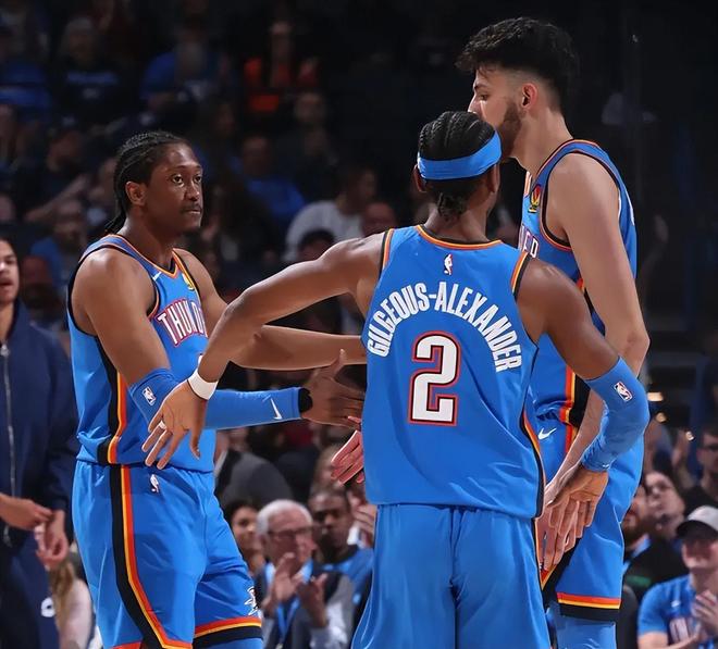 当然,俗话说‘火车要能跑得快,全靠车头带’,雷霆三巨头无疑才是这支球队成功的基石。赛季至今,大当家亚历山大场均可以轰下32.6分4.6篮板6.5助攻的全面数据,命中率高达56.2%。已经连续96场比赛得到20+,本赛季24场比赛中19次砍下30+,其中12次完成三节打卡下班,再次成为MVP的最大热门之一,不少媒体甚至将他与乔丹相提并论。