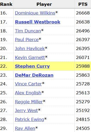 目前排在他身前的是森林狼和绿军名宿凯文-加内特,库里预计在近几场比赛中就将完成超越。