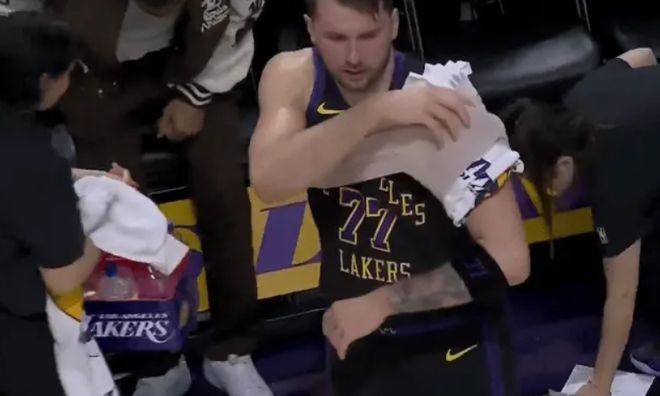 东契奇第三节下场后走回更衣室,目前已回到替补席肩部戴上了冰敷,受伤了?