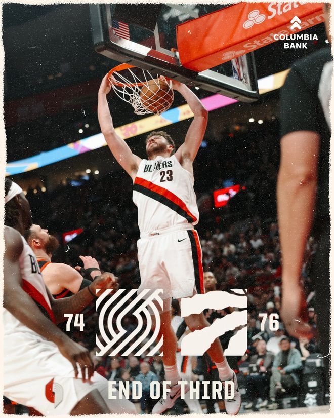 双方在第三节开始后继续拉锯战,猛龙队顶住对手的多波反扑保持领先,霍勒迪和卡马拉分别投中三分,第三节还有6分25秒时开拓者队追成63平。迪克还击三分,勒夫又中 三分,克林根也投中三分,开拓者队扳为71平。英格拉姆两罚一中,勒夫突破得手,开拓者队反超领先。阿巴吉挺身而出连拿4分帮助球队重夺领先,格兰特两罚一中,三节结束时开拓者队以74-76落后2分。