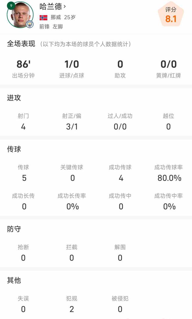 统计显示,哈兰德本场比赛出场86分钟,4次射门3次射正,打入1球。