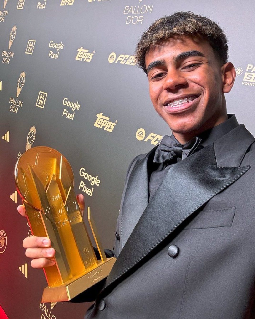 在获奖后,亚马尔与奖杯进行了自拍,其笑容十分灿烂。