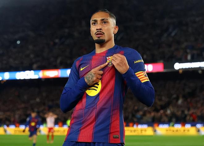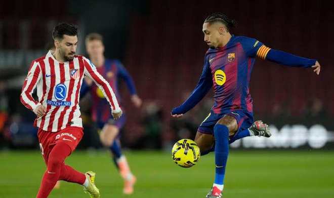 比赛开始不到二十分钟,马竞的巴埃纳单刀破门,边裁举了越位旗,VAR看了之后又改了判,巴萨一下子被压得喘不过气,五分钟后拉菲尼亚冷静推射把比分扳平,这是他九年对马竞第一次进球,看