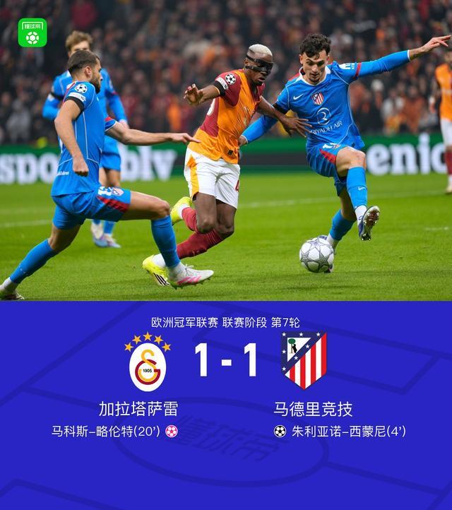 北京时间1月22日,欧洲冠军联赛联赛阶段第7轮,加拉塔萨雷与马德里竞技展开对决。上半场鲁杰里传中,朱利亚诺-西蒙尼头球闪击,之后绍洛伊传中,略伦特自摆乌龙。最终马竞客场1-1战平加拉塔萨雷。