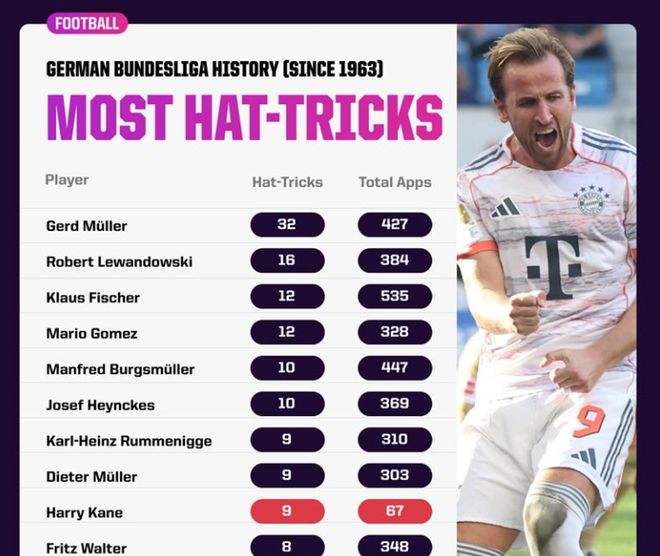 周六的帽子戏法是他在短短67场德甲比赛中的第9次戴帽。德甲历史上仅有6名球员的帽子戏法次数超过他,而这些球员都至少出战了328场比赛。