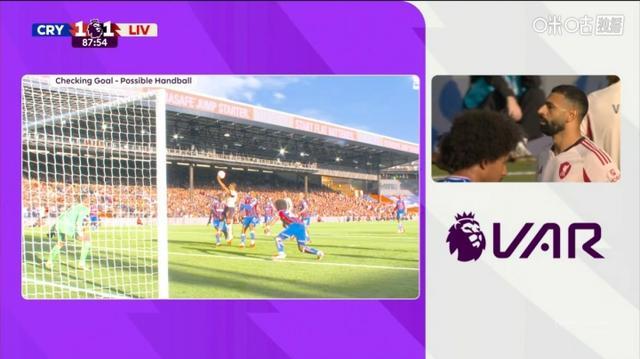 直播吧09月28日宣 英超第6轮,水晶宫vs利物浦。比赛第87分钟,基耶萨替补破门为利物浦一度1-1扳平比分,VAR检查了此球过程中萨拉赫的疑似手球,并确认进球有效。