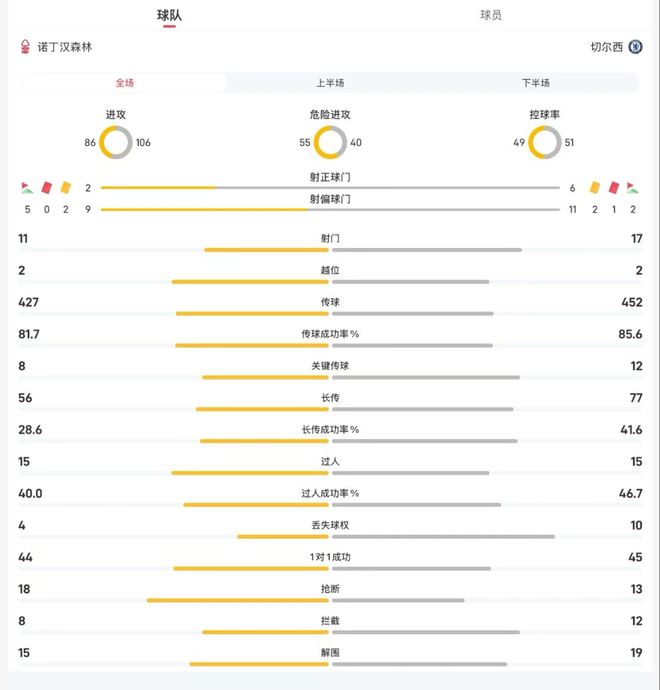 诺丁汉森林vs切尔西全场数据:射门1117,控球率五五开