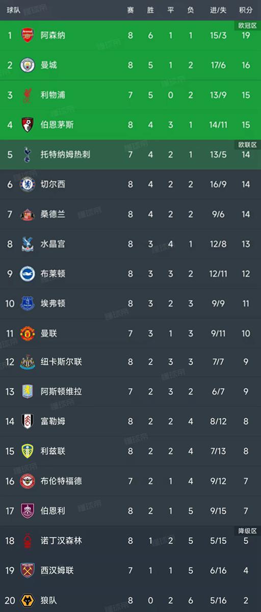 北京时间10月19日,英超第8轮结束了7场比赛,最新积分榜如下!