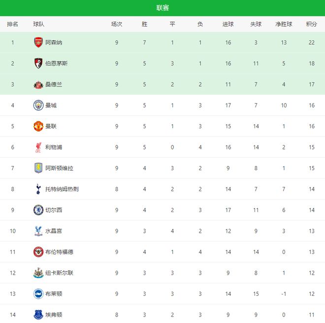 英超第九轮战罢,领头羊阿森纳继续狂飙,1-0险胜水晶宫强势领跑积分榜,埃泽打入全场唯一进球;曼城则是在客场0-1爆冷倒在维拉脚下,连胜就此终结;大黑马伯恩茅斯主场2-0完胜诺丁汉森