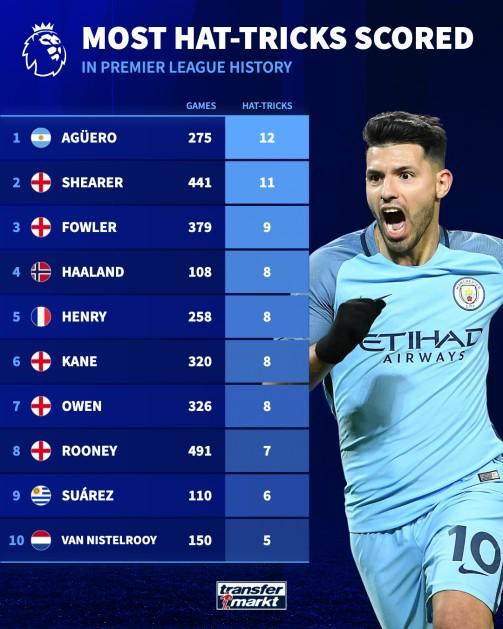 北京时间11月11日,德转统计出了英超历史完成帽子戏法次数最多的10名球员,阿圭罗以12次排名第一,阿兰-希勒11次第二,哈兰德8次位列第四。