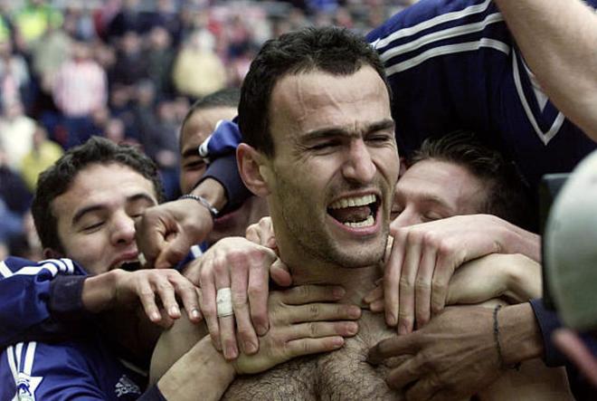 照片中,他赤裸上身,双眼炯炯有神,身边是兴奋的队友,他在2002年客场面对桑德兰时打入制胜球。