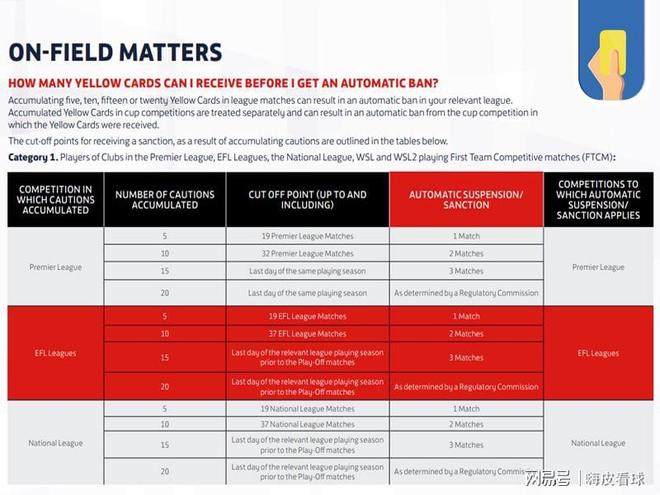 从英超提供的规则中可以得知,前面19轮英超比赛中,累积5张黄牌的球员,将会接受1场停赛的处罚,前面32轮英超比赛中,累积10张黄牌的球员,将会接受2场停赛的处罚。累积15张黄牌,将停赛3场,累积20张黄牌,需要通过规则委员会来裁定处罚。而且,从规则来看,累积黄牌似乎只能在联赛接受处罚,不能通过国内杯赛来“洗牌”。