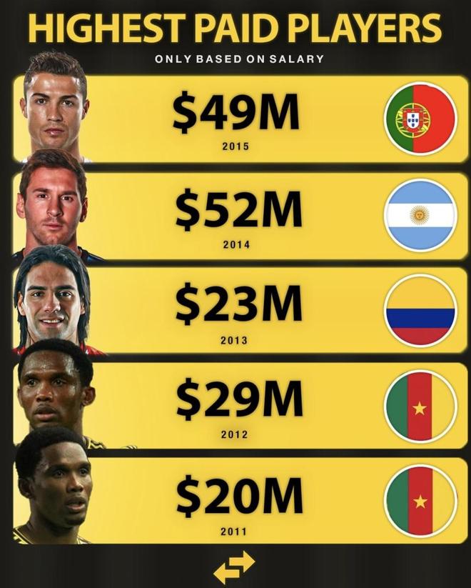 2015 | C罗 | 0.49 亿美元 | 3.53 亿元人民币 | 皇家马德里