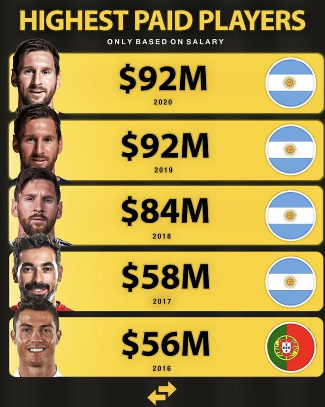 2020 | 梅西 | 0.92 亿美元 | 6.62 亿元人民币 | 巴塞罗那