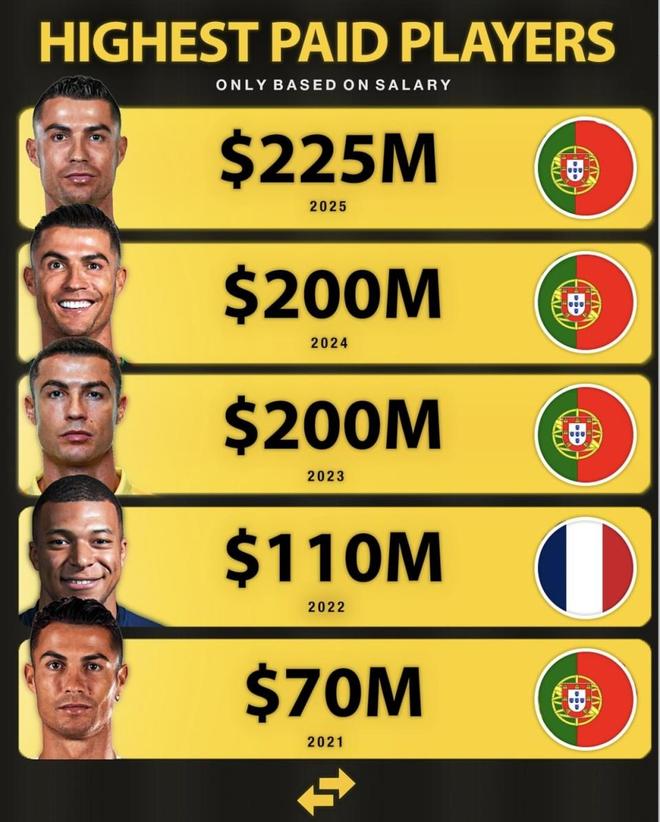 2025 | C罗 | 2.25 亿美元 | 16.2 亿元人民币 | 利雅得胜利