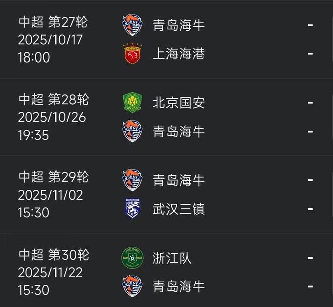 目前这两支同积18分排在积分榜的倒数第二和第三位,青岛海牛仅以净胜球优势身位领先高出降级区。最后四轮海牛将面对海港、国安、三镇和浙江,长春将面对河南、天津、国安和青岛西海岸。