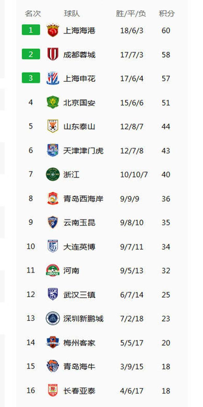10月19日,中超联赛第27轮完成最后两场比赛,大连英博海发主场0-0战平武汉三镇,河南队坐镇主场2-0击败长春亚泰。