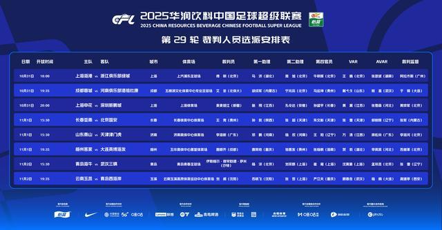 中超29轮裁判:傅明执法海港vs浙江,沙特籍裁判担任海牛vs三镇主裁